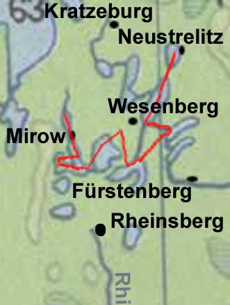 Wir fuhren mit dem Zug von Magdeburg über Wittenberge nach Neustrelitz, unser Startpunkt. Wir paddelten über den Zierker See, durch den Kammerkanal, den Woblitzsee nach Wesenberg, Wangnitz-, Gr. Priepertsee (also die Havel entlang) bis Priepert, den Ellenbogensee weiter nach Canow. Dann fuhren wir über den Labussee, durch den Dollbeck (Stonikanal), über den Gobenowsee, den Drosedower Bach, Rätzsee, Oberbeck, den Vilzsee und den Schwarzen See nach Schwarz. Durch einen kleinen Kanal (Treideln und Umragen) zum Zotzensee bis nach Mirow. Weiter durch den Mirower See bis zum Granzower Möschen nach Granzow und zurück nach Mirow, unsere Aussatzstelle. |
