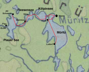 weiter über den Fleesensee zum Zeltplatz bei Silz. Von dort aus Richtung
