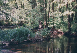 flach und es liegen öfters umgestürzte Bäume im Wasserlauf.
